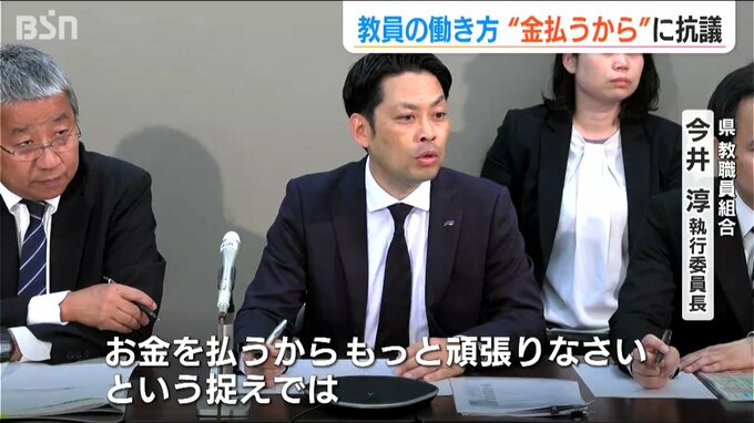 【県教職員組合 今井淳 執行委員長】「お金を払うからもっと頑張りなさいという捉えでは学校現場は成り立っていないという状況をお伝えしたい」