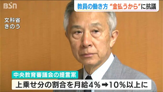 教員の働き方改革などを議論してきた文部科学省の諮問機関が、残業代の代わりに給与に上乗せして支給する割合の引き上げなどを盛り込んだ提言案を示しました。ただ、新潟県内の県教職員組合は「実効性のある対策になっていない」と抗議しています。