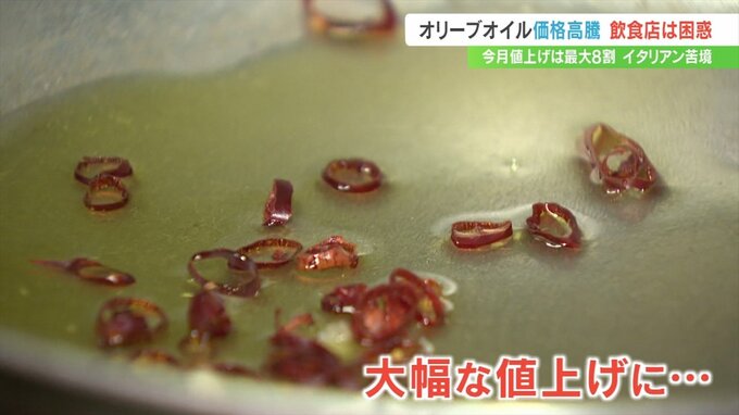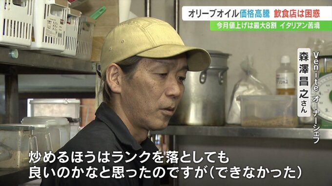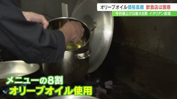 メニューの8割にオリーブオイルを使用するため、その大幅な値上げに頭を悩ませています。