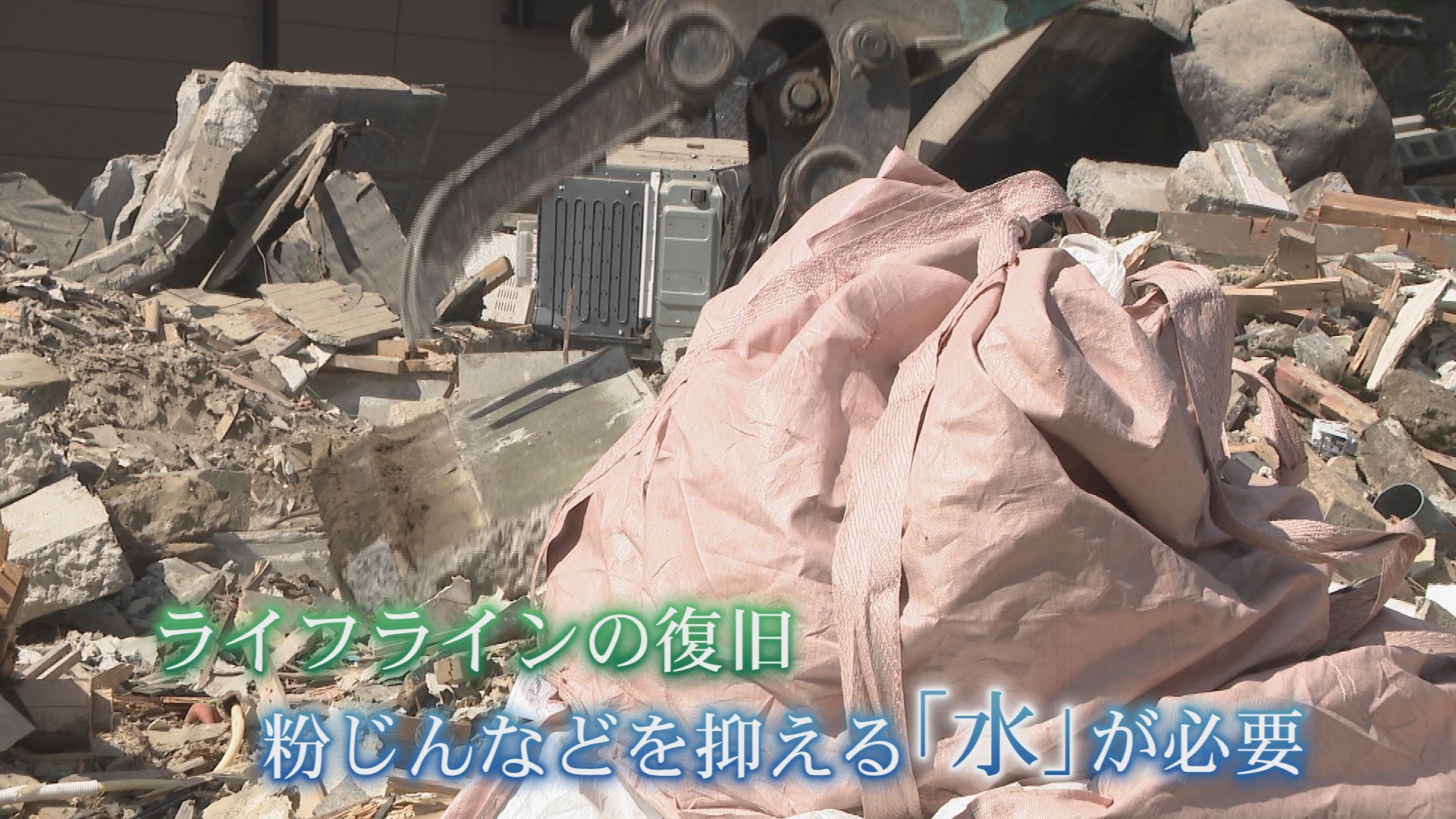 建物に残された家財道具は、原則、工事が始まる前に取り出す必要がありますが、建物が完全に潰れているなど、危険を伴う場合には、住民の同意を得た上で工事と並行しながら業者が撤去するケースもあるといいます。さらに、作業の進捗を左右するのは、ライフラインの復旧。解体で出る粉塵やほこりを抑えるのに、欠かせないのが「水」です。