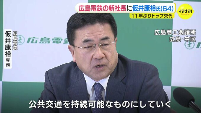 広島電鉄は14日、椋田昌夫 社長に代わり、仮井康裕 専務が新たな社長に昇格する人事を発表しました。広島電鉄 仮井康裕 専務「公共交通を持続可能なものにしていく。みなさん喜んでいただけるようなことを進めて…