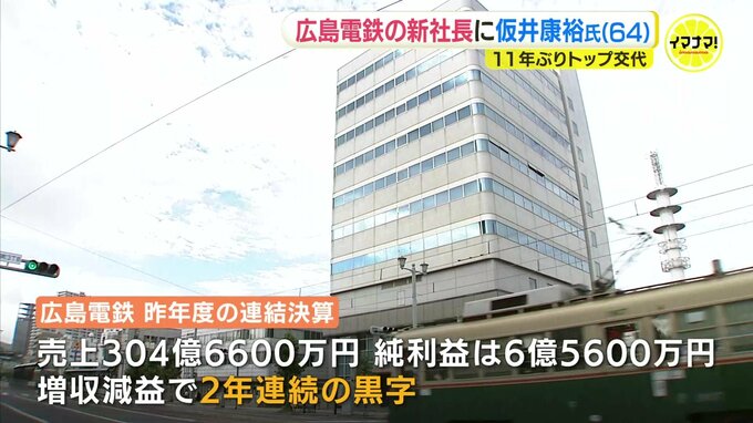広島電鉄のトップ交代は11年ぶりで、仮井専務は、来月の株主総会を経て新社長に就任する予定です。また、14日に発表された広島電鉄の昨年度の連結決算は、売り上げが304億6600万円、純利益は6億5600万円となり、増収減益で2年連続の黒字となりました。