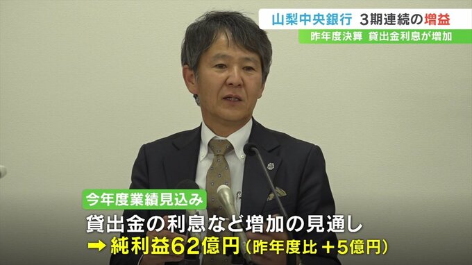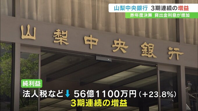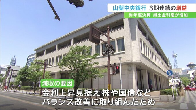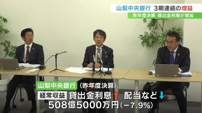 山梨中央銀行は昨年度の決算を発表し貸出金の利息の増加などにより3期連続の増益となりました。