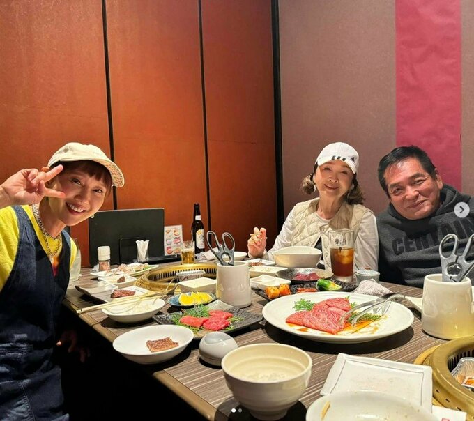 そして「夜はいつもの焼き肉屋さんへ。こうして元気に家族揃って焼き肉へ。私も本当に久しぶりにお肉を食べました」「母は意外に大食いなので、元気に食べている姿を見ながら、ありがたさでちょっとジーンとしました。」と、家族で焼き肉を楽しむ写真を添えて報告。