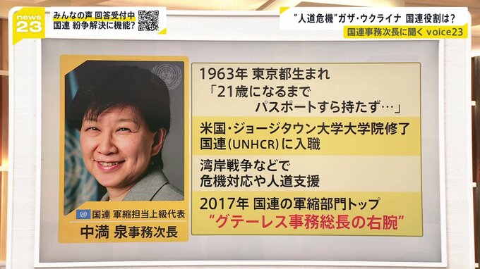 国連トップの“右腕”中満泉事務次長が「news23」に生出演。終わりが見えないガザやウクライナの紛争。今、問われる国連の役割とは。