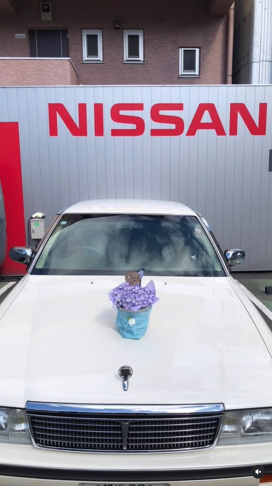 伊藤さんは、NISSANという赤いロゴが掲げられたガレージに停められ、ボンネットに薄紫のあじさいの鉢を乗せた愛車シーマの動画を掲載。「シーマ6ヶ月点検終わりました」と一言だけを綴っています。