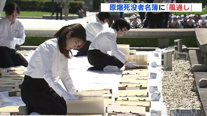 平和公園(広島市)の原爆慰霊碑に納められている死没者名簿の「風通し」が行われました。ことしは初めてインターネットでもライブ配信されました。(黙とうする広島市職員)原爆死没者名簿の風通しは、湿気を取り…