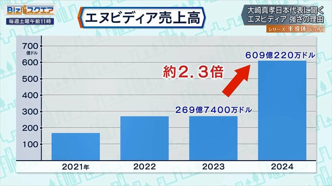 一方、2024年の売上高は609億ドル余りで、2023年に比べて2倍以上に急成長している。時価総額は2兆ドルを超え、アメリカの株式市場を牽引する「マグニフィセント・セブン」に選ばれている。