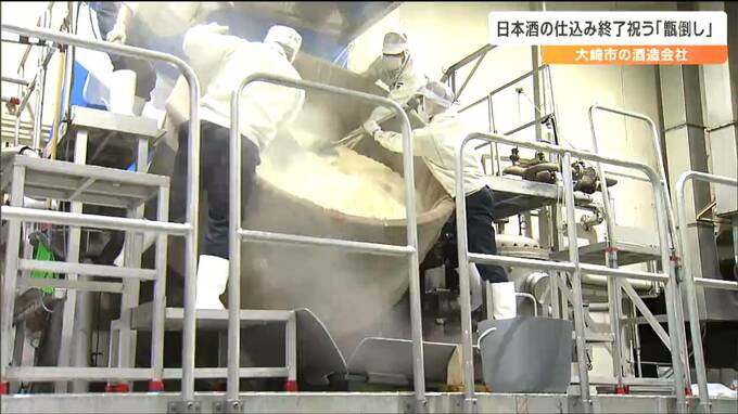 日本酒造りに使う酒米を蒸し終えたことに感謝する神事「甑倒(こしきたお)し」が15日、宮城県大崎市の酒造会社で行われました。大崎市松山の酒造会社、一ノ蔵です。今シーズンの酒造りで最後となる酒米の「トヨニ…