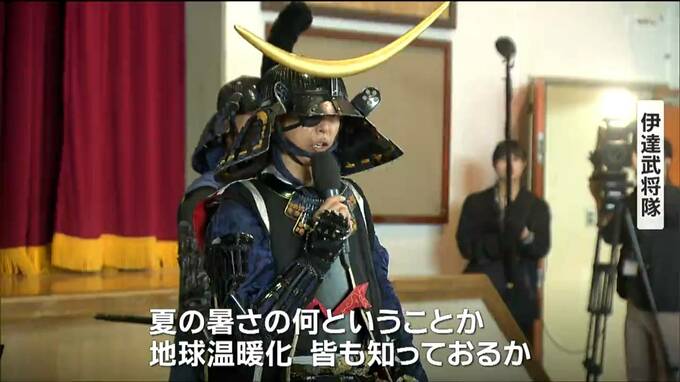 仙台市泉区の長命ヶ丘小学校で行われたグリーンカーテン用の種の贈呈式では、伊達武将隊が5年生の児童に省エネの大切さを呼びかけました。式では、児童たちが夏の暑さを和らげるのに植物のグリーンカーテンが効果があることを学びました。伊達武将隊からアサガオやゴーヤーの種を受け取った児童たちは、大きなグリーンカーテンを育てることを約束していました。