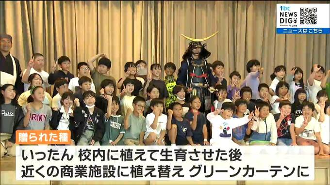 贈られた種は一旦、校内に植えて生育させた後、近くの商業施設に植え替えてグリーンカーテンとして育てるということです。