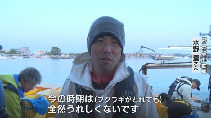 第三定栄丸船頭 水野豊さん:「今の時期は(フクラギが獲れても)全然うれしくないです。(網の中で)ホタルイカが痛めつけられるので、品物が悪くなるので」