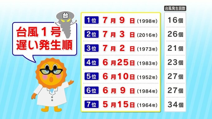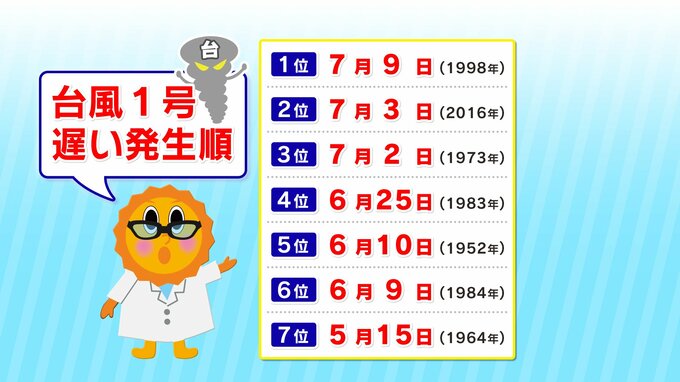 6月中の台風1号発生は過去3回、7月になってからの台風1号発生は、過去3回あって、最も遅い台風1号の発生の記録は7月9日(1998年)となっています。