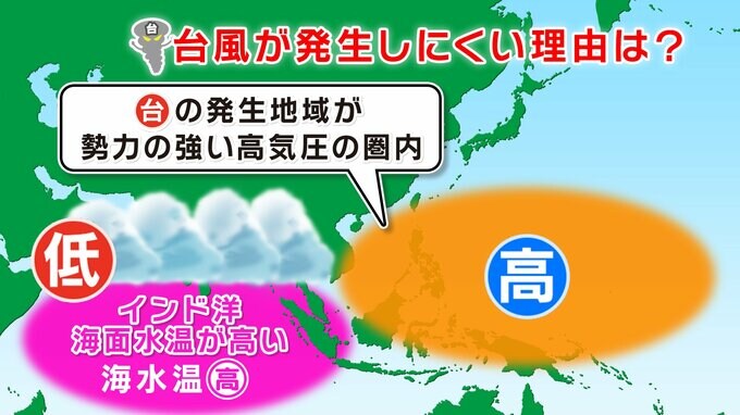 インド洋付近の【低気圧】がフィリピン付近の【高気圧】を強めるため、台風が発生しやすい領域が、その勢力の強い高気圧に覆われ、台風の発生が抑制されます。