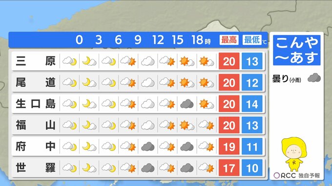 きょう15日(水)の広島県は、晴れ間もありましたが、前線からの湿った空気の影響を受け、昼過ぎから雲が広がりやすくなりました。最高気温は、加計で26.9 ℃、府中市では26.2℃まで上がり、夏日になった地点もありました。