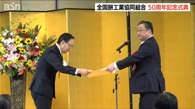 全国餅工業協同組合の創立50周年を記念した式典が新潟市で開催されました。式典には全国餅工業協同組合に加盟する全国の17社が参加。 国内産のもち米だけを使い良質で安全・安心な包装餅を作り続けてきたことなど…