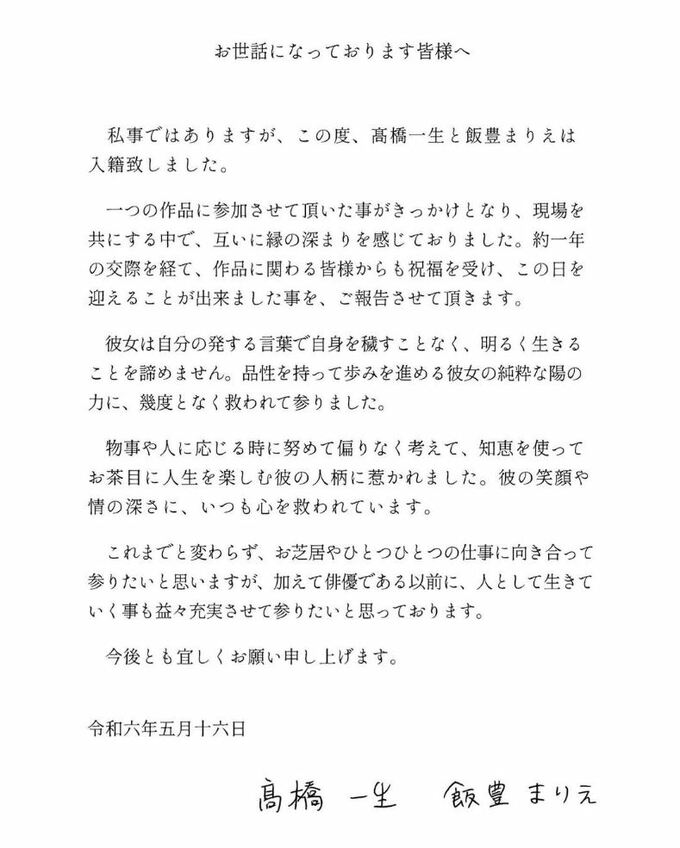 インスタグラムにアップされた文書では「私事ではありますが、この度、高橋一生と飯豊まりえは入籍致しました。」と、直筆の署名と共に報告。