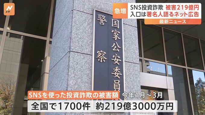 SNSを使った投資詐欺による被害額が、今年1月から3月までの間に全国であわせて219億3000万円に上ったことが警察庁のまとめで分かりました。警察庁によりますと、SNSを使った投資詐欺の被害額は、今年1月から3月ま…