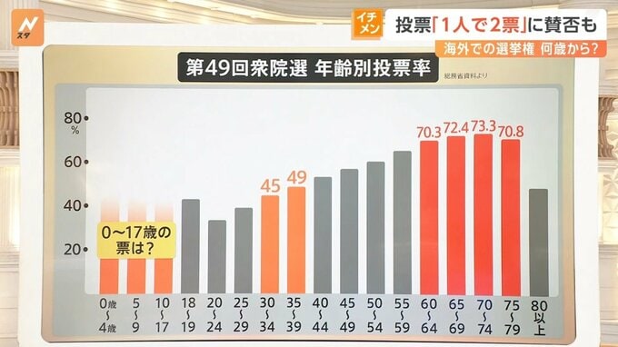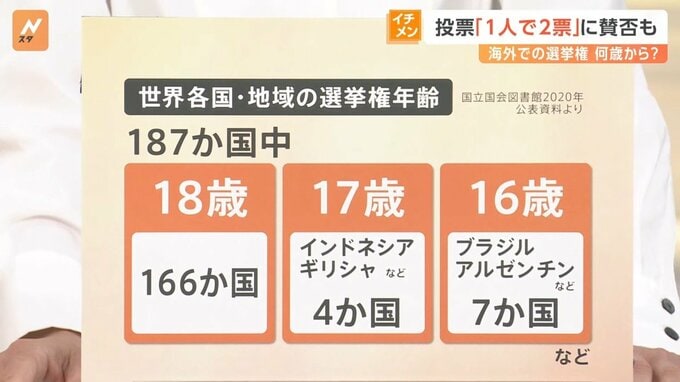 ここにもし0歳から入ってくると、どれくらいの投票率になってくるのかも注目ではありますが、海外に目を向けてみると、選挙権の年齢について18歳としているのが187か国中の166か国で、最も多いです。17歳がインドネシアやギリシャなど4か国、16歳がブラジルやアルゼンチンなど7か国ということで、0歳としているのは世界にも例を見ない状況でした。