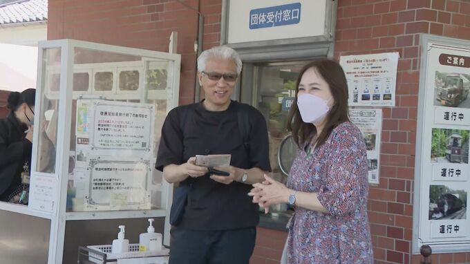 明治村の5000万人目の入村者となったのは、東京から訪れた國井さん夫婦で、中川武館長から記念のプレートと花束が手渡されました。