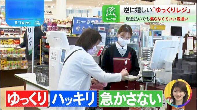 「ゆっくりレジ」では、お客さんとコミュニケーションをとりながら丁寧にきめ細やかなサービスで対応していることがわかります。