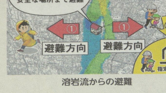 裏の面では避難するタイミングや、溶岩流に対して直交方向に逃げることなど避難する方法を解説しています。