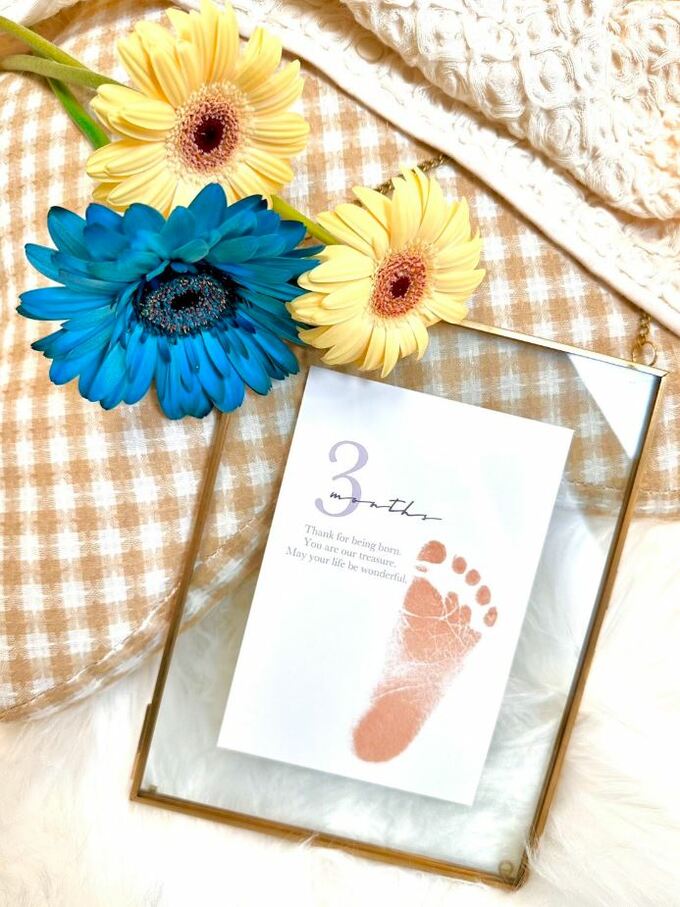 小島さんはほんの一言、「3ヶ月。おぱぴまる。」とだけ投稿。そして、3輪の花とともに「3 month」と記されてガラスの額に飾られた、小さな右足の足形の写真が添えられています。