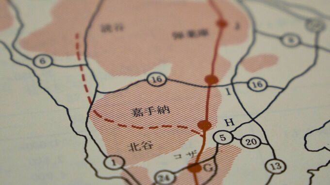 そんな「本気」の鉄道構想だが、路線の想定図を見ると、旧石川市まで伸ばす路線を示す赤い線は、大部分が米軍基地のなかを通っていた。