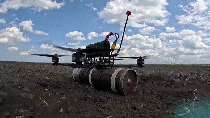 虫の羽音のようなプロペラ音。飛んでいるのは円筒形の爆弾を積んだドローン。この映像には、ドローンから爆弾を切り離し、塹壕に落とす様子も…
