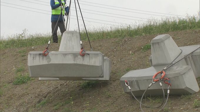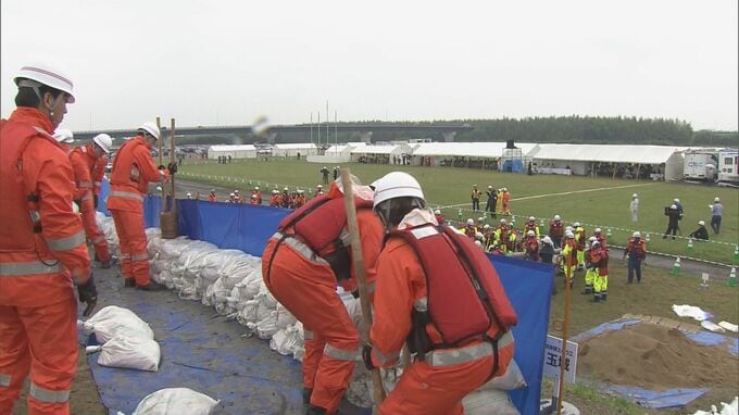 この水防訓練は伊勢湾台風に相当する超大型の台風が紀伊半島に接近し、三重県各地で洪水や高潮の被害が発生したことを想定したものです。訓練では川の水位が上昇して氾濫するのを防ぐために土のうを積み上げる作業や堤防の決壊した箇所に重機でブロックを積む作業などに取り組みました。
