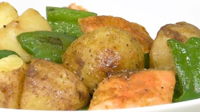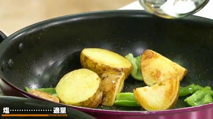 5.じゃがいもに焼き目がついたらピーマンを加えて炒める