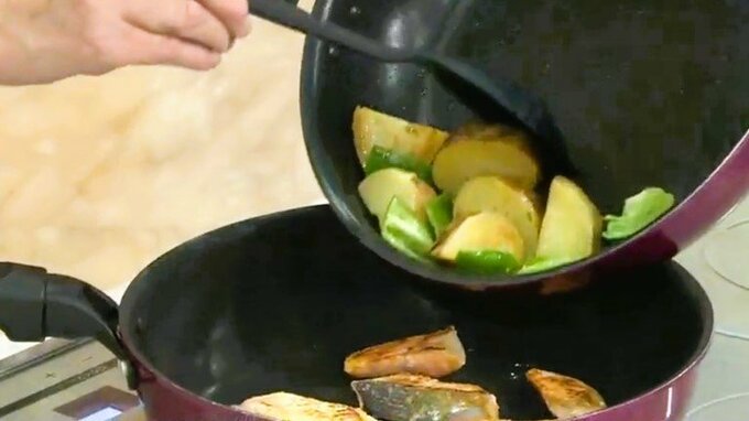 6.ピーマンに火が通ったら塩を振り、鮭を炒めたフライパン入れる