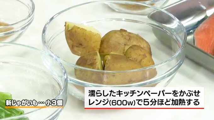2.新じゃがいもを耐熱容器に入れて湿らせたキッチンペーパーをかぶせレンジ(600w)で5分ほど加熱する