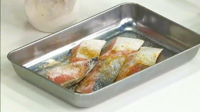 3.鮭に塩とカレー粉を振り小麦粉をまぶし、フライパンにサラダ油を引いて焼く