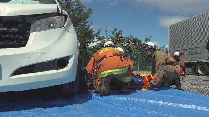 そして、空気圧で車を持ち上げる専用の道具を使って、下敷きになった人を救助したほか、車内に閉じ込められた人を救助するための窓ガラスの割り方などを訓練しました。