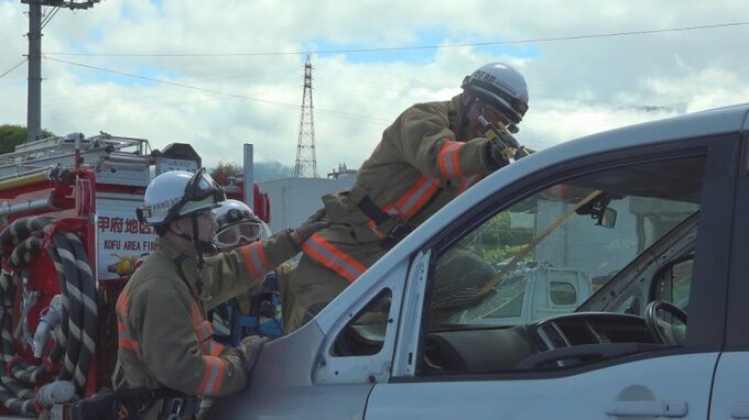 交通事故で車の中に閉じ込められた人などを救助する訓練が山梨県中央市で行われました。