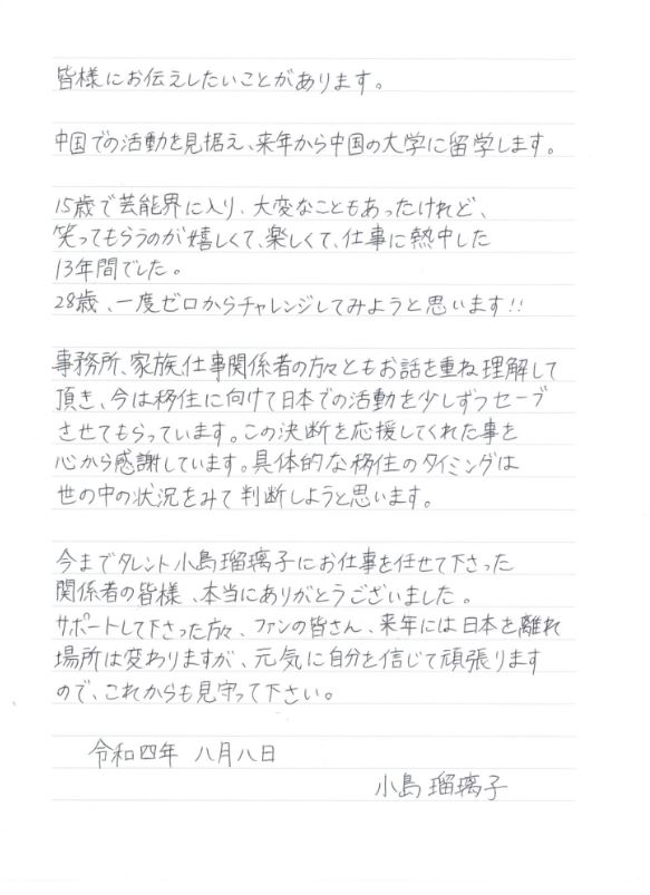 タレントとして活躍する小島瑠璃子さんが、来年から中国の大学に留学することを自身のSNSで公表しました。小島さんは自身のツイッターに直筆のメッセージをアップし、「15歳で芸能界に入り、大変なこともあったけれど、