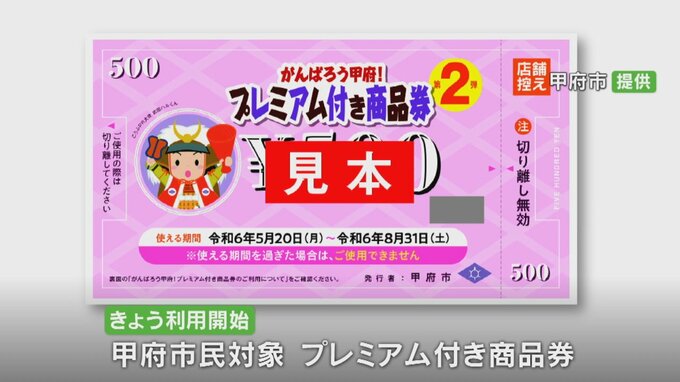 プレミアム付き商品券の利用期間は5月20日から8月31日までのおよそ3か月間で、甲府市内の小売店や飲食店、ガソリンスタンドなど約1300店で利用できます。