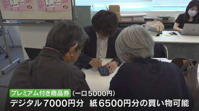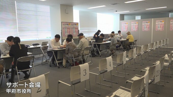 甲府市役所に設置されたサポート会場にはデジタル商品券を申し込んだ市民が次々と訪れ、スマートフォンを片手にログイン方法や購入の仕方などを聞いていました。