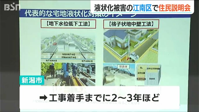 説明会は1時間ほど行われ新潟市は将来の地震に備えて検討している液状化を発生しにくくする事業について想定される工事の方法を説明。被害状況の分析や調査を経て工事に着手するまでに2、3年ほどかかることなどが示されました。