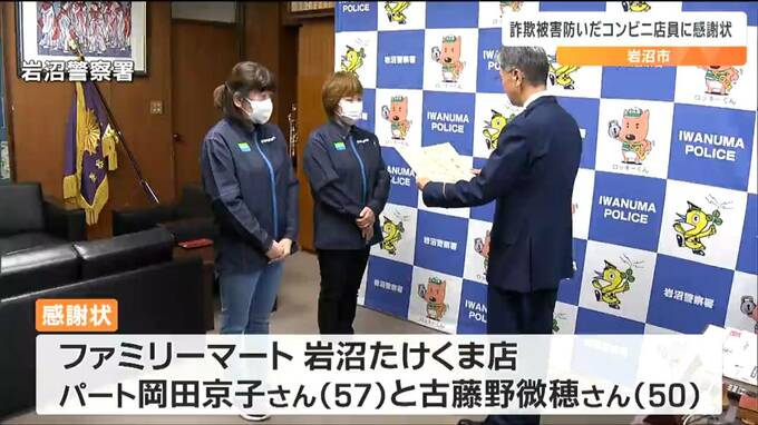 4月、50代の男性が架空請求で金をだまし取られるのを未然に防いだとして、宮城県岩沼市のコンビニで働く2人に警察から感謝状が送られました。