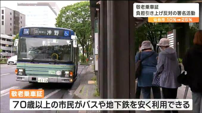 仙台市の敬老乗車証の自己負担が25%に引き上げられることについて、市民団体が20日、現在の負担率を維持することを求める署名活動を行いました。敬老乗車証問題連絡会のメンバー:「これでは高齢者が外に出歩くこ…