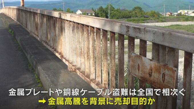 こうした金属のプレートや太陽光発電施設の銅線ケーブルが盗まれる被害は全国で相次いでいて、金属の高騰を背景に犯行グループが売却目的で盗みを重ねているとみられています。