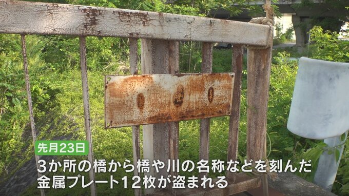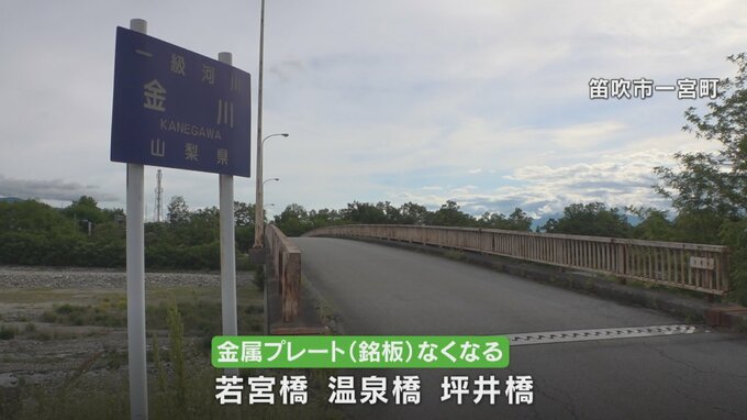 笛吹市によりますと4月23日、この3か所の橋から橋や川の名称を刻んだ金属のプレート合わせて12枚が何者かに盗まれたということです。