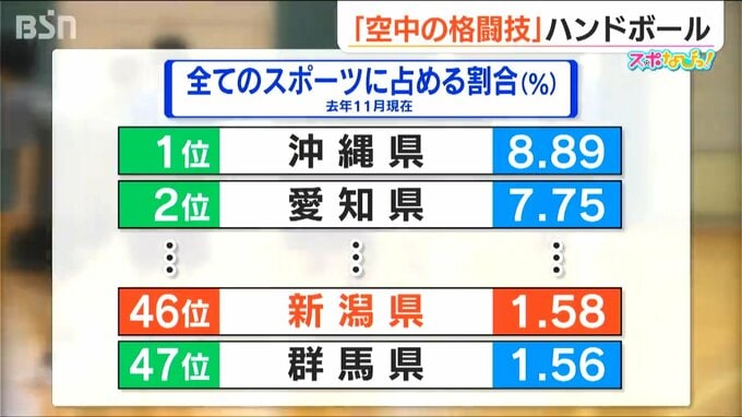 さらにすべてのスポーツに占める割合では、ハンドボールの新潟県の競技人口は47都道府県の中でワースト2位。