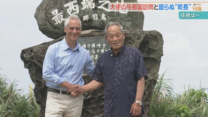 天候が良ければ台湾をのぞむことができる西崎灯台で大使を迎えた糸数町長。笑顔で肩を組む場面もあったが、その後、報道各社の取材に応じることは最後までなかった。