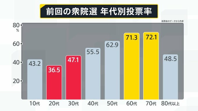 若者の声が反映されていないのは大きな課題ですが、前回の衆院選の年代別の投票率(総務省のデータから作成)をみると、60代:71.3%、70代:72.1%の投票率が70%を上回っているのに対し、20代:36.5%、30代:47.1%と若者の投票率が低い状況です。