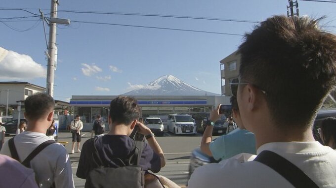 コンビニエンスストア越しに富士山が見える外国人観光客に人気の撮影スポットで富士山を隠す黒い幕の設置作業が完了しました。