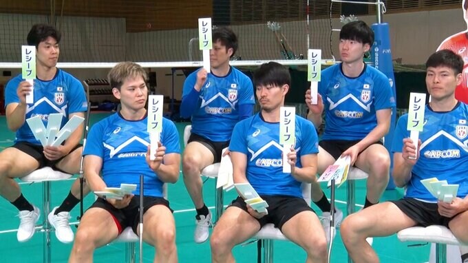 6人が考える日本の強みとは。「スパイク」、「レシーブ」、「ブロック」、「サーブ」の4つの札から一つだけ選んでもらった。