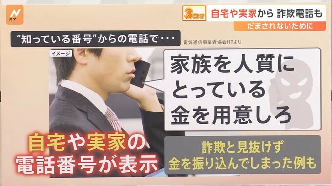 家族からの連絡だと思い電話に出ると「家族を人質にとっている。金を用意しろ」と脅され、詐欺と見抜けず金を振り込んでしまった例もあるということです。